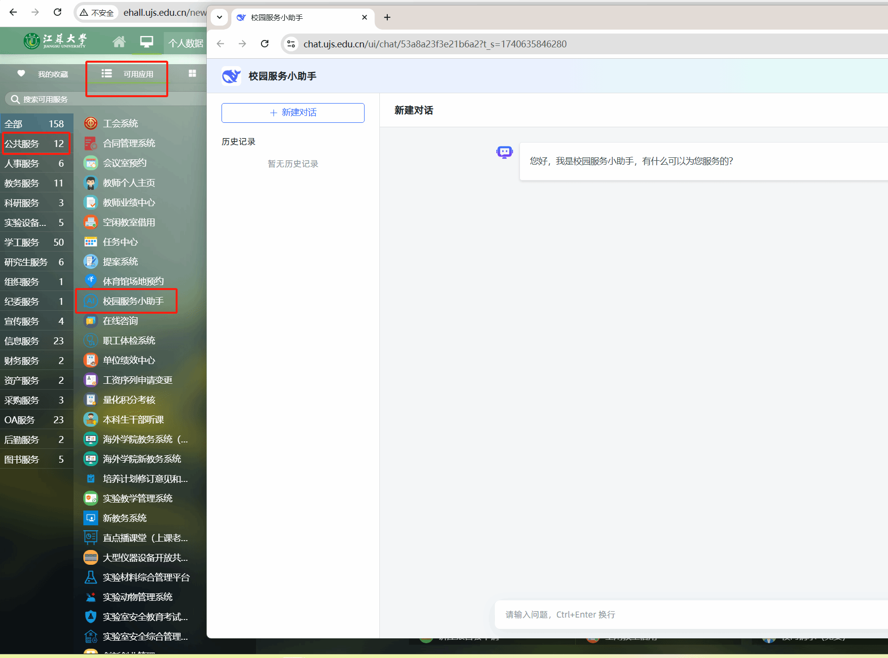 師生在手機端通過“江蘇大學企業微信”—“工作臺”—“DeepSeek大模型應用”—“校園服務小助手”菜單即可進入應用;在電腦端通過登錄綜合服務門戶,在“可用應用”欄目中選擇“公共服務”,即可便捷使用“校園服務小助手”功能。