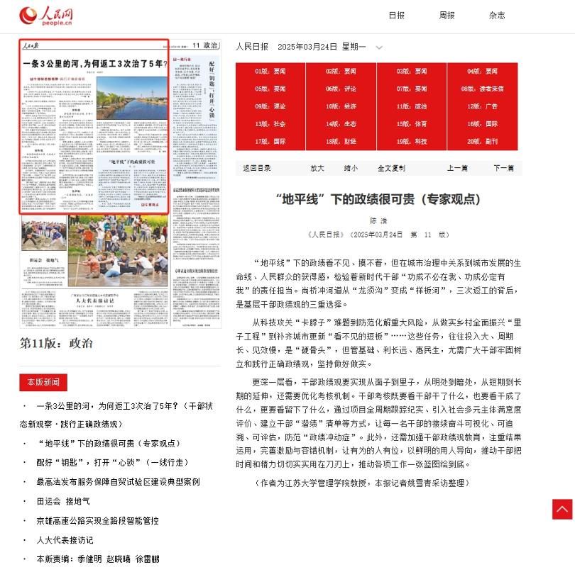 3月24日,《人民日報》政治版刊發我校管理學院陳浩教授題為《“地平線”下的政績很可貴》的專家點評文章。文章以江蘇揚州邗江區尚橋沖河道治理為案例,深入剖析基層干部踐行正確政績觀的重要意義,為新時代城市治理與干部考核機制提供了理論參考。