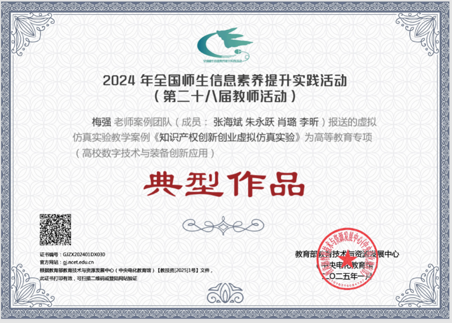 近日,在教育部教育技術與資源發展中心(中央電化教育館)2024年全國師生信息素養提升實踐活動(第二十八屆教師活動)中,我校梅強教授案例團隊的虛擬仿真實驗教學案例《知識產權創新創業虛擬仿真實驗》被評為高等教育專項(高校數字技術與裝備創新應用)典型作品。