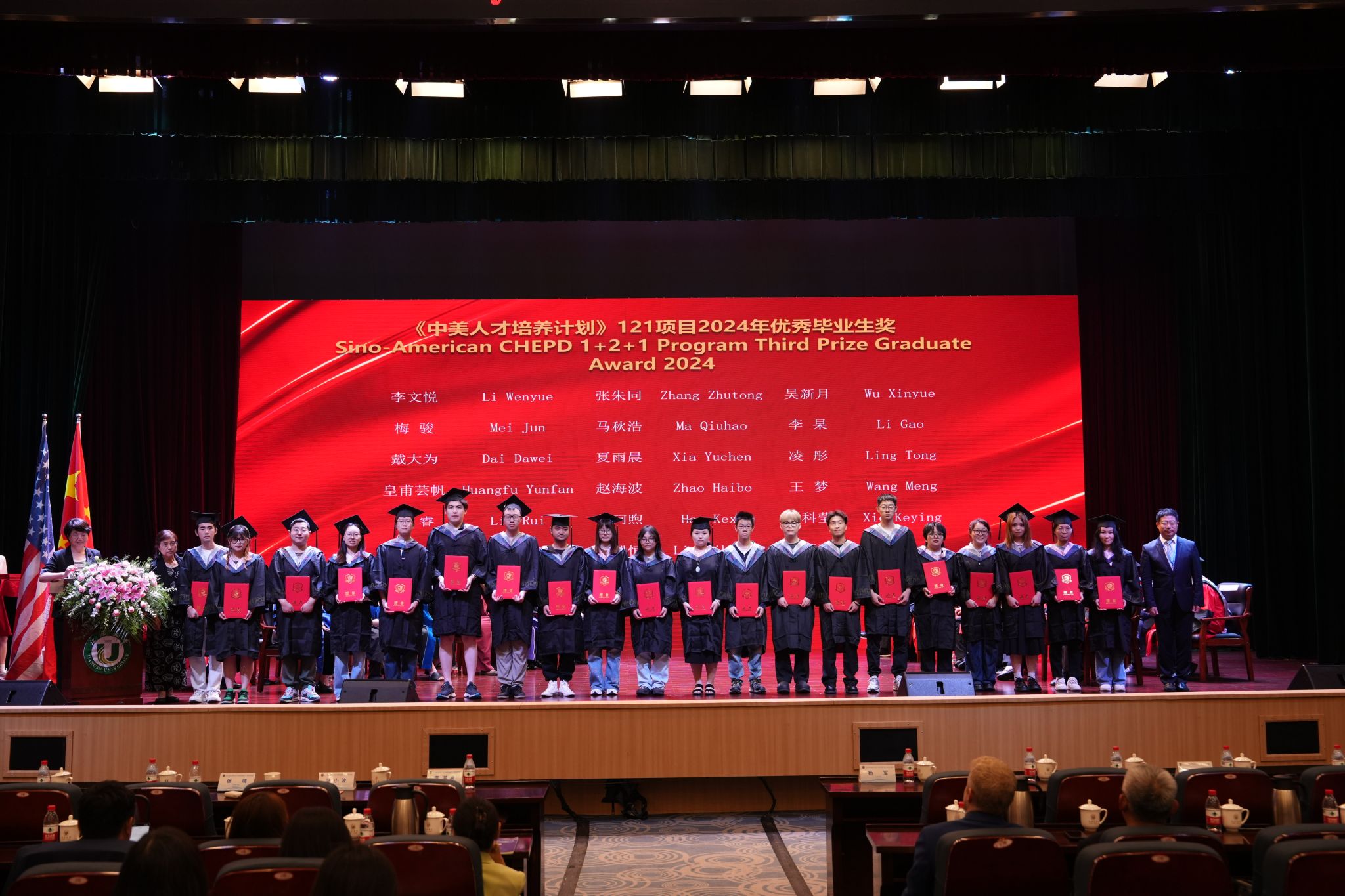 畢業典禮上,中美大學校長為畢業生代表頒發學位證書,還表彰了《中美人才培養計劃》121項目2024年度優秀畢業生獎、杰出畢業生獎和卓越畢業生獎。