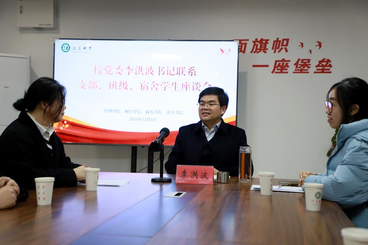 12月4日,校黨委書記李洪波走進毓秀書院、求實書院,與所聯系的管理學院本科生工商支部、物流2202班、財經學院寢室的同學交流座談,指導學生的學習與成長。