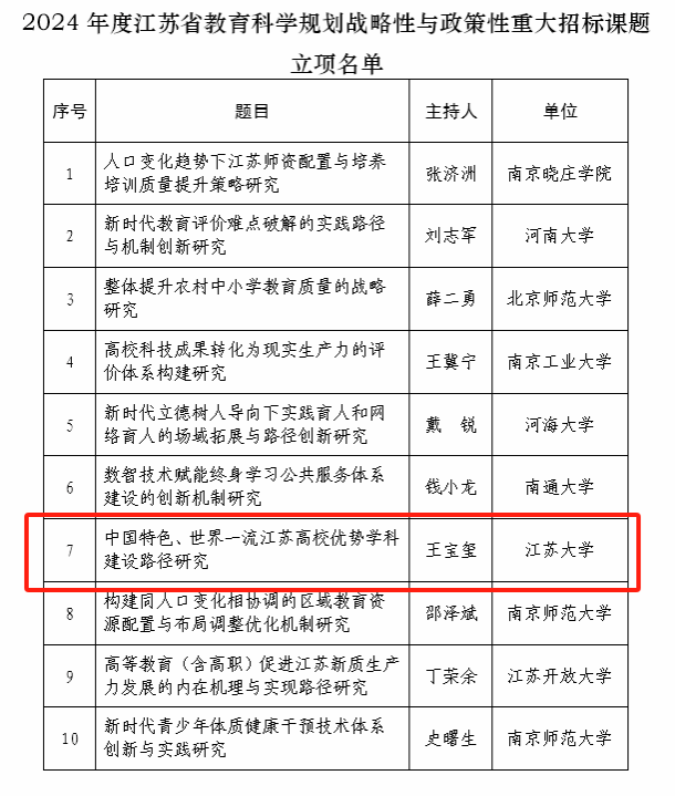 近日,江蘇省教育科學規(guī)劃領(lǐng)導小組辦公室發(fā)布2024年度江蘇省教育科學規(guī)劃戰(zhàn)略性與政策性重大招標課題立項名單,共立項10項,我校教師教育學院教授王寶璽申報的《中國特色、世界一流江蘇高校優(yōu)勢學科建設(shè)路徑研究》獲批立項。