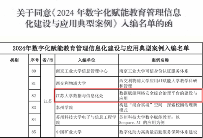 近日,教育部教育管理信息中心公布2024年數字化賦能教育管理信息化建設與應用典型案例評選結果,我校數據與信息化處自主創新研發并申報的案例“數據賦能網絡安全綜合治理平臺的建設與應用”成功入選。全國共58所高校入選,其中江蘇6所。