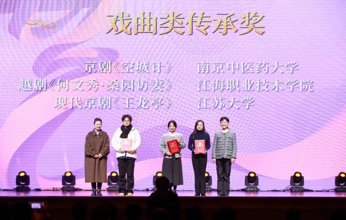 12月20日,2024江蘇省大學(xué)生戲劇展演活動(dòng)頒獎(jiǎng)儀式在江蘇大劇院舉行。由我校教師馮磊等指導(dǎo)的戲曲作品《孟麗君·書房會(huì)》《王龍亭》分別榮獲2024江蘇省大學(xué)生戲劇展演戲曲類優(yōu)秀傳承獎(jiǎng)和傳承獎(jiǎng),首次實(shí)現(xiàn)該項(xiàng)賽事全部獲獎(jiǎng)。