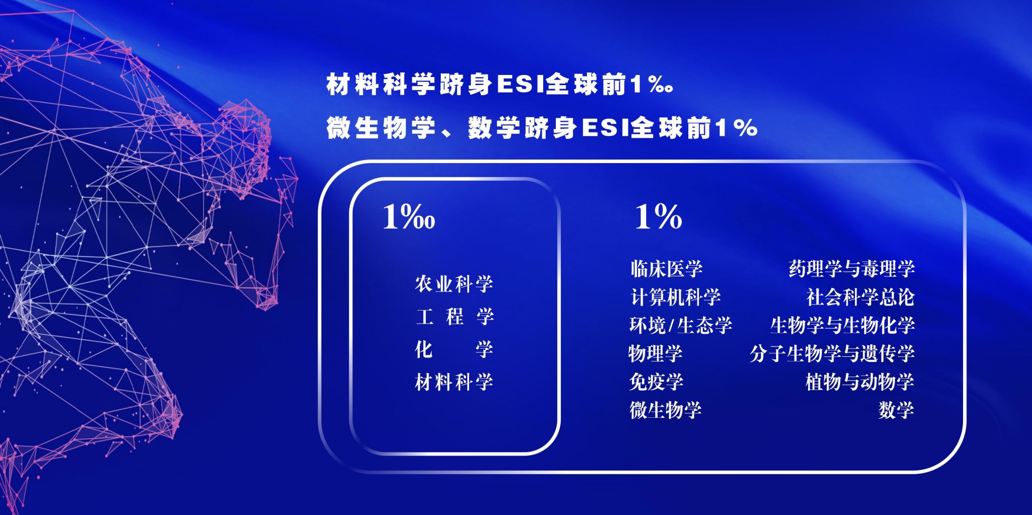 ESI全球排名前1‰學科+1,前1%學科+2。2024年,我校材料科學躋身ESI全球前千分之一學科,微生物學、數學躋身ESI全球前百分之一學科,ESI前千分之一學科數達4個,前百分之一學科數達16個。農業科學由1月的0.426‰上升至0.291‰,排名由全球52位上升至38位;工程學由1月的0.351‰提升至0.269‰,排名由全球84位上升至70位。學校ESI綜合影響力全球排名第369位,較2023年提升75位,中國大陸高校排名第40位。