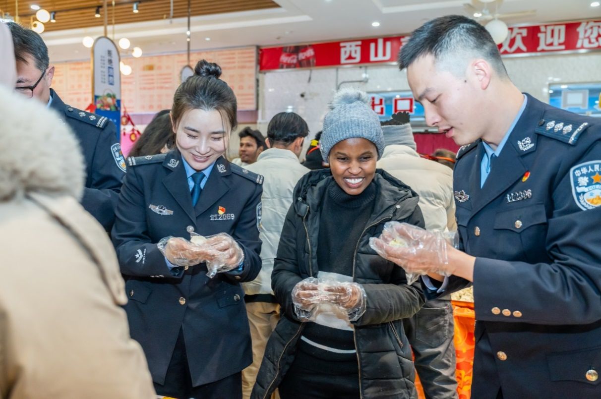 聯歡會現場,留學生和教師們用歌舞、游戲等表達對乙巳農歷新年的期待,活動還設置了寫春聯、剪窗花、包餃子等多個文化互動比賽環節。在寫春聯比賽中,留學生們揮毫潑墨,透露出對中國文化的熱愛和尊重;在剪窗花比賽中,留學生們剪出了一個個精美的窗花作品,為即將到來的春節增添了喜慶氣氛;在老師的指導下,留學生們學習包餃子,體驗中國傳統美食的制作過程。師生共同品嘗餃子,分享勞動成果,交流中外飲食文化,送上新春祝福,氣氛熱鬧。