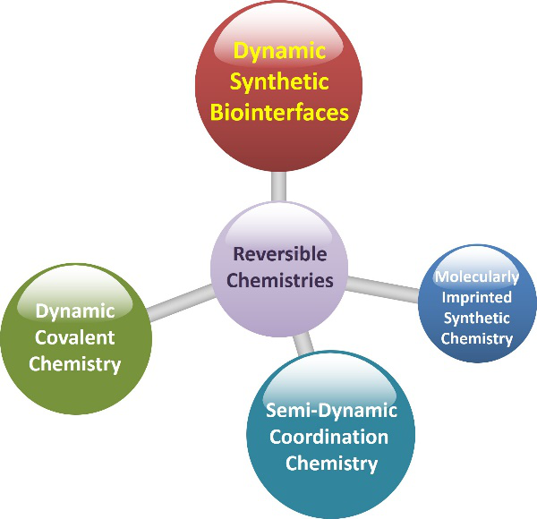 如何在生物材料界面模擬天然細(xì)胞外基質(zhì)的動(dòng)態(tài)性能是生物醫(yī)學(xué)研究領(lǐng)域的一個(gè)重要科學(xué)問(wèn)題。該綜述論文系統(tǒng)闡述了潘國(guó)慶教授課題組近年來(lái)在動(dòng)態(tài)生物界面材料領(lǐng)域的諸多系統(tǒng)性研究工作。其課題組以模擬生理環(huán)境的刺激響應(yīng)性、拓展生物功能多樣化以及生物應(yīng)用廣泛性為出發(fā)點(diǎn),創(chuàng)新性地將多種可逆的化學(xué)作用(1. 可逆共價(jià)化學(xué)作用;2. 分子印跡可逆識(shí)別作用;3. 動(dòng)態(tài)金屬配位化學(xué)作用) 用于生物活性分子的表面功能化,成功地在生物材料界面實(shí)現(xiàn)多種細(xì)胞行為的可控調(diào)節(jié)。相關(guān)研究成果發(fā)表了多篇高水平論文,如:J. Am. Chem. Soc., 2014, 136, 6203; Angew. Chem. Int. Ed., 2018. 57, 7878; Adv. Funct. Mater., 2017, 27, 1605985; Small, 2018, 4 (13), 1703968; Angew. Chem. Int. Ed., 2011, 50, 11731; Angew. Chem. Int. Ed., 2013, 52, 1511; Small, 2019, 15, 180391; Angew. Chem. Int. Ed., 2013, 52, 6907; Angew. Chem. Int. Ed., 2017, 56, 15959; J. Am. Chem. Soc., 2016, 138, 15078等。上述一系列工作巧妙地借助化學(xué)策略在生物材料表界面實(shí)現(xiàn)了動(dòng)態(tài)的生物學(xué)效應(yīng),所提出的分子策略受到國(guó)內(nèi)外同行的廣泛關(guān)注和采納,有望為生物材料的仿生設(shè)計(jì)以及生物系統(tǒng)的反饋性研究提供新的思路。