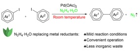 針對以上問題,本研究采用廉價易得的肼作為還原劑,低至百分之一用量的醋酸鈀作為催化劑,實現了芳基鹵化物的偶聯,為聯芳香環類化合物的合成提供了一條高效的綠色途徑。該方法實驗操作簡單,無需隔絕空氣和水,并且由于肼參與反應后的副產物為氮氣和水,減少了廢料的排放,符合綠色合成的理念。相關成果以“Ligand-free palladium catalyzed ullmann biaryl synthesis: ‘household’ reagents and mild reaction conditions”為題發表于國際一流期刊《Green Chemistry》(DOI:10.1039/C8GC03862G IF 8.586)。該論文得到了導師朱純銀教授的指導。(化學化工學院)