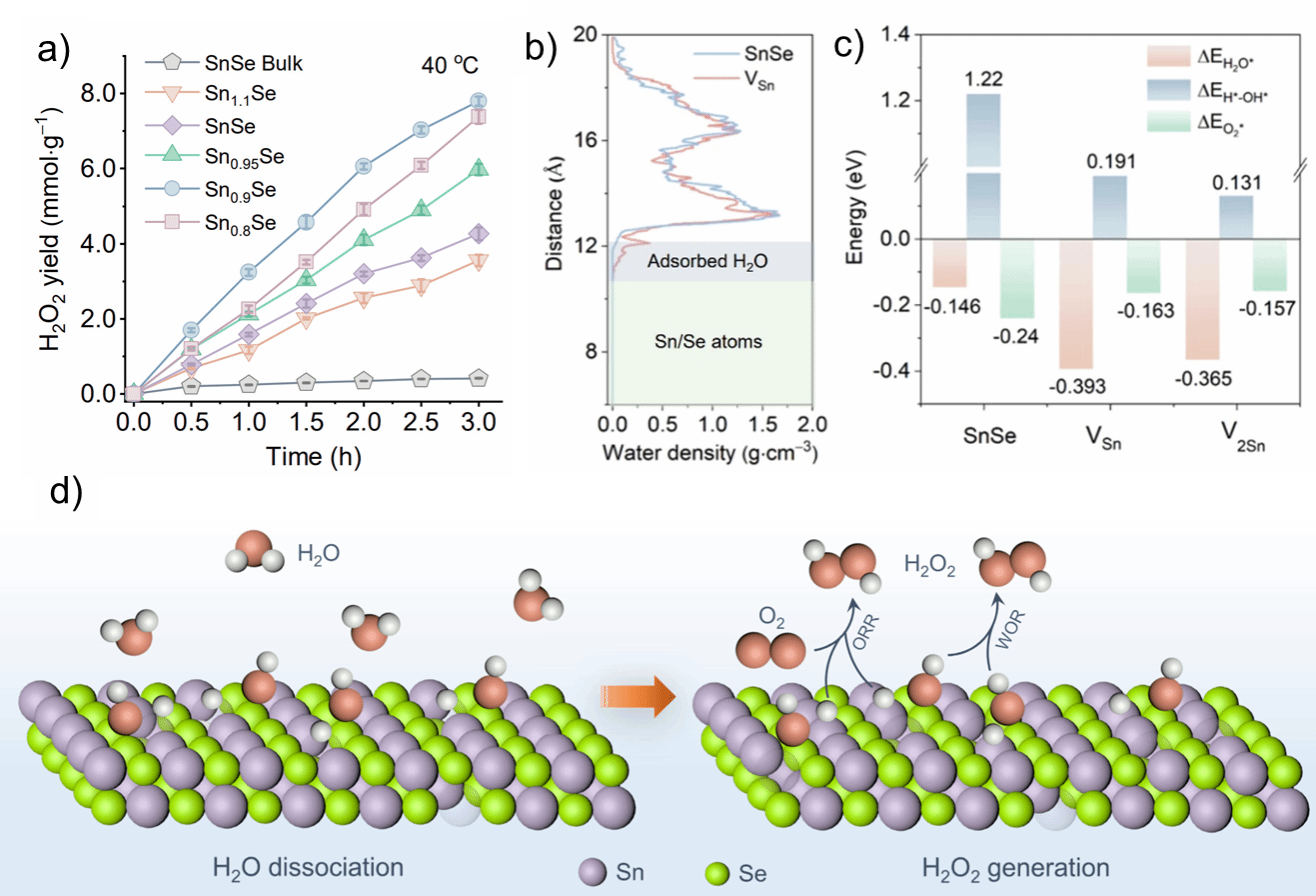 圖 a)為富Sn空位的SnSe納米片在40°C下催化水和氧氣合成雙氧水性能;圖 b)為水分子沿SnSe表面法向的濃度分布的分子動力學模擬;圖 c)為SnSe及含Sn空位的SnSe對水的解離能;圖 d)為Sn空位缺陷誘導水分子解離及雙通道生成雙氧水機理示意圖。