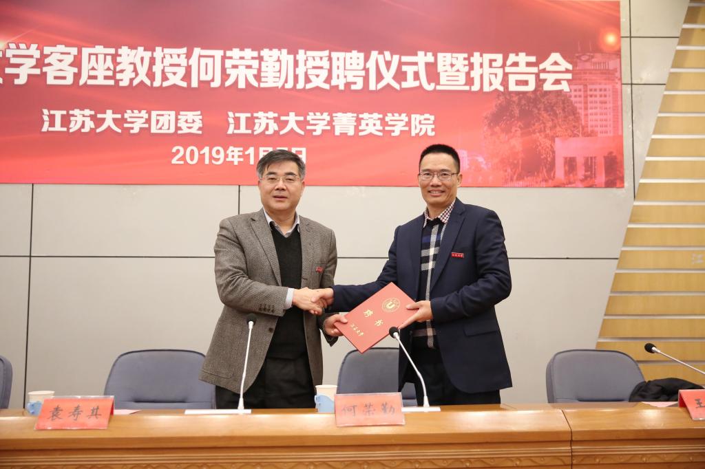 1月5日,江蘇大學(xué)客座教授何榮勤受聘儀式暨學(xué)術(shù)報(bào)告會(huì)在會(huì)議中心第一報(bào)告廳舉行。校黨委書記袁壽其出席,并為何榮勤教授佩戴校徽并頒發(fā)聘書。受聘儀式由副校長(zhǎng)張濟(jì)建主持,校團(tuán)委全體工作人員、菁英學(xué)院學(xué)員、第二期大骨班學(xué)員以及部分校、院學(xué)生干部參加儀式。