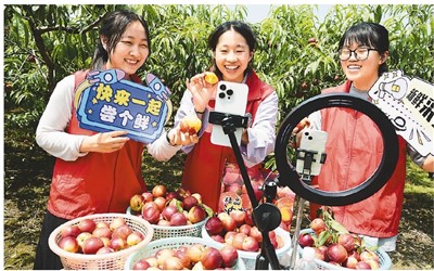 在江蘇省鎮江市益平村果農的桃園里,江蘇大學志愿者幫助果農直播推銷油桃。石玉成攝(人民圖片)