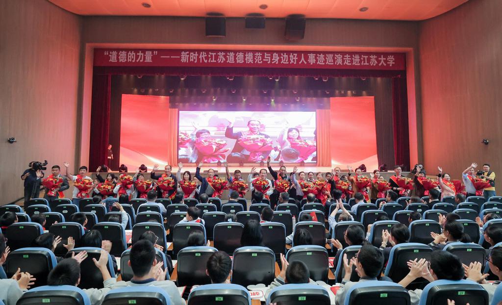 10 月 25 日下午,江蘇大學大禮堂內座無虛席,由中共江蘇省委宣傳部、江蘇省文明辦、江蘇省教育廳主辦的 " 道德的力量 " ——新時代江蘇道德模范與身邊好人事跡高校巡演走進該校,讓榜樣之光照亮校園。