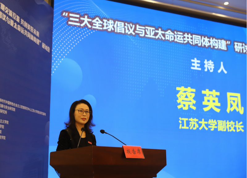 江蘇大學副校長蔡英鳳教授主持會議致辭環節。江蘇大學黨委書記李洪波在致辭中表示:“當前,世界之變、時代之變、歷史之變,正以前所未有的方式展開,針對大變局時代的多重全球治理困境,習近平總書記先后提出全球發展倡議、全球安全倡議和全球文明倡議,形成了圍繞人類命運共同體理念的中國‘三大全球倡議’,為解決全球發展問題、安全問題和文明交流互鑒問題,提供了切實可行的路徑和方案,為國際社會進步描繪了新愿景,獲得了廣泛認同。構建亞太命運共同體是構建人類命運共同體理念的重要組成部分,也是中國在亞太地區推進經濟一體化,并攜手亞太國家共同發展、互利共贏的偉大實踐活動”。